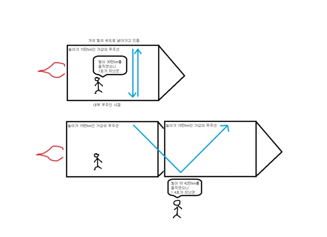아래우주선(b)에서의 속도와 빛의속도는 항상 더해진다는 물리현상을 근본으로 설명하고있습니다//