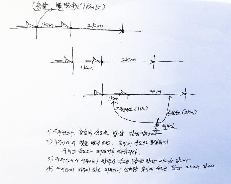 1. 빛과 총알의 속도는 우주선의 관성 속도와 상관없이 항상 변하지 않는 상수 입니다