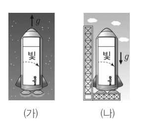 3) 우주선의 한쪽 벽면에서 방출된 빛 은 그림 (가)와 같이 가속도 운동을 하는 우주선 안의 관측자가 볼 때 휘어져 진행하며, 등가 원리에 의해 (나)와 같이 지구 표면에 정지해 있 는 우주선 안의 관측자가 볼 때도 휘어져 진행한다.