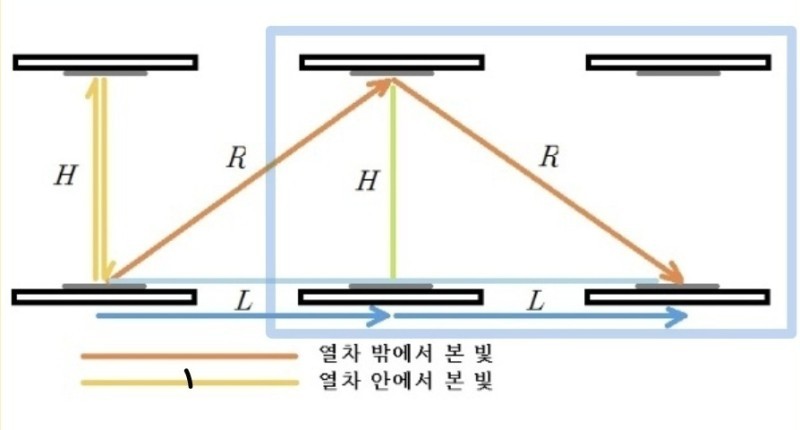 우주선 안에서 관측한 우주선 빛시계에서 발사된 빛의 이동 백터 방향은 항상 수직으로만 관측되어야만 합니다