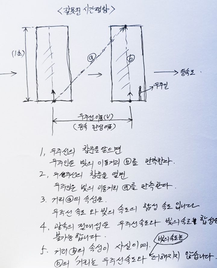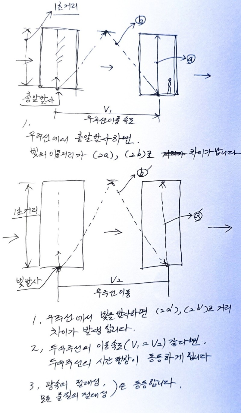 * 등속 관성속도,가속도,중력의 시간팽창 * 에서 우주 공간에서 물체를 알짜힘으로 가속할때 물체의 시간팽창은 일어난다고 합니다 에서 우주 공간에서 등속 관성이동하는 물체의 알짜힘은 0이며,가속도 역시 0입니다 알짜힘,가속도가 0인 상황에서도 물체의 시간팽창은 발생한다고 합니다 물체의 시간팽창 공식은) 일반상대성 이론에서는 아인슈타인의 장방정식으로 구합니다 특수상대성 이론에서는 로렌츠 법칙으로 시간팽창을 구합니다 물리학계에서 모든 관성계(등속 관성계와 정지 관성계)의 물리법칙은 모두 동일하다고 정의 합니다 물체의 등속 관성계의 물리법칙은 정지 관성계의 물리법칙과 완전히 동일해야 합니다 위의 의 내용을 처럼 등속 관성계에서는 정지 관성계와 같이 시간팽창이 일어나지 않아야 합니다 그러나 가속계에서의 물체가 가..
